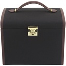 Štvorposchodová čierna šperkovnica s otváracími bočnými stranami na uloženie ďalších šperkov. Povrch je vyrobený z polyesteru s hnedým interiérom z mikorofázy. Veko šperkovnice je doplnené praktickým zrkadlom a vreckom na drobné šperky.
